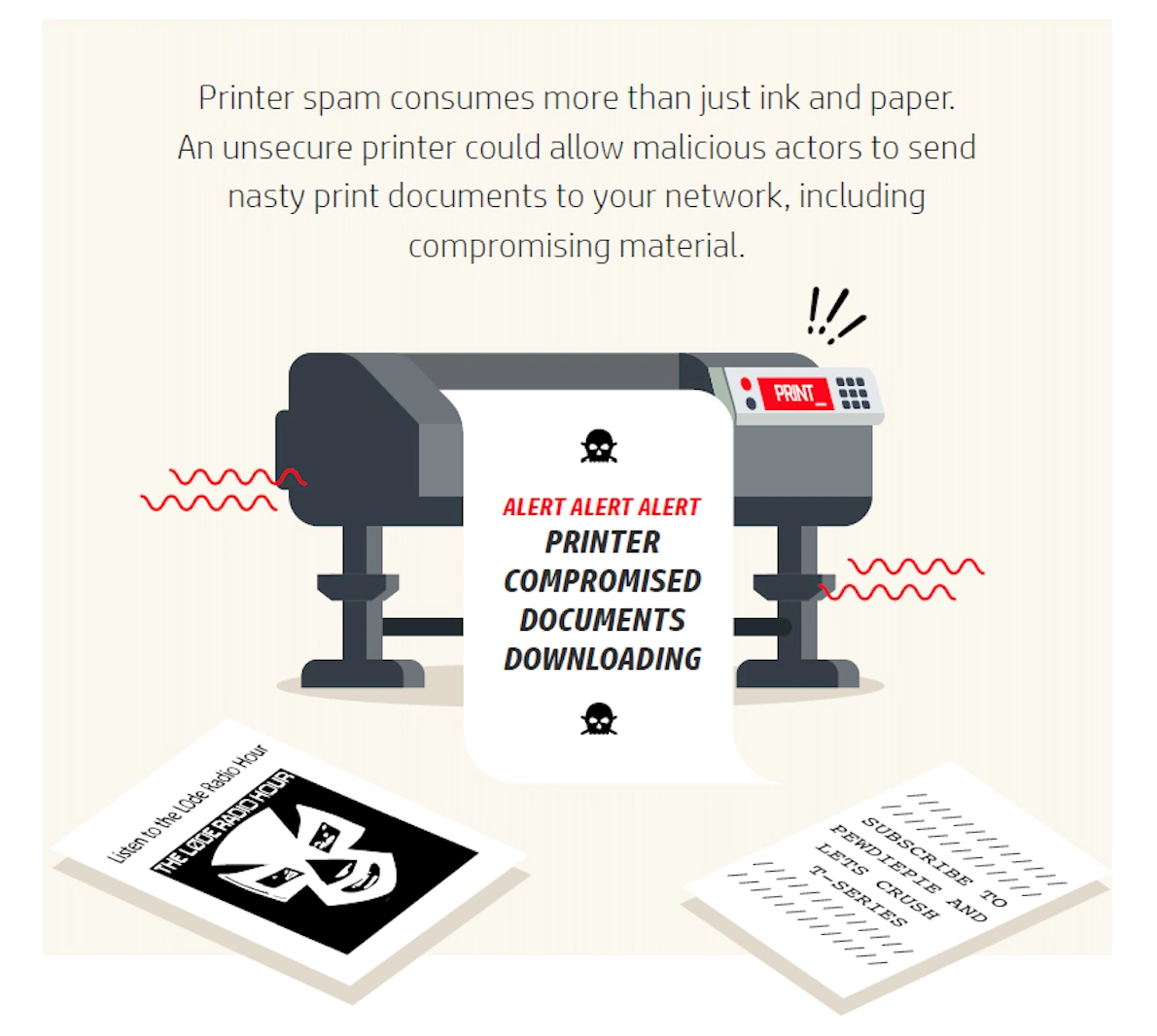 Printer spam consumes more than just ink and paper. Besides hurting your company’s efforts to go green, an unsecure printer could allow malicious actors to send nasty print documents to your network, including compromising material.