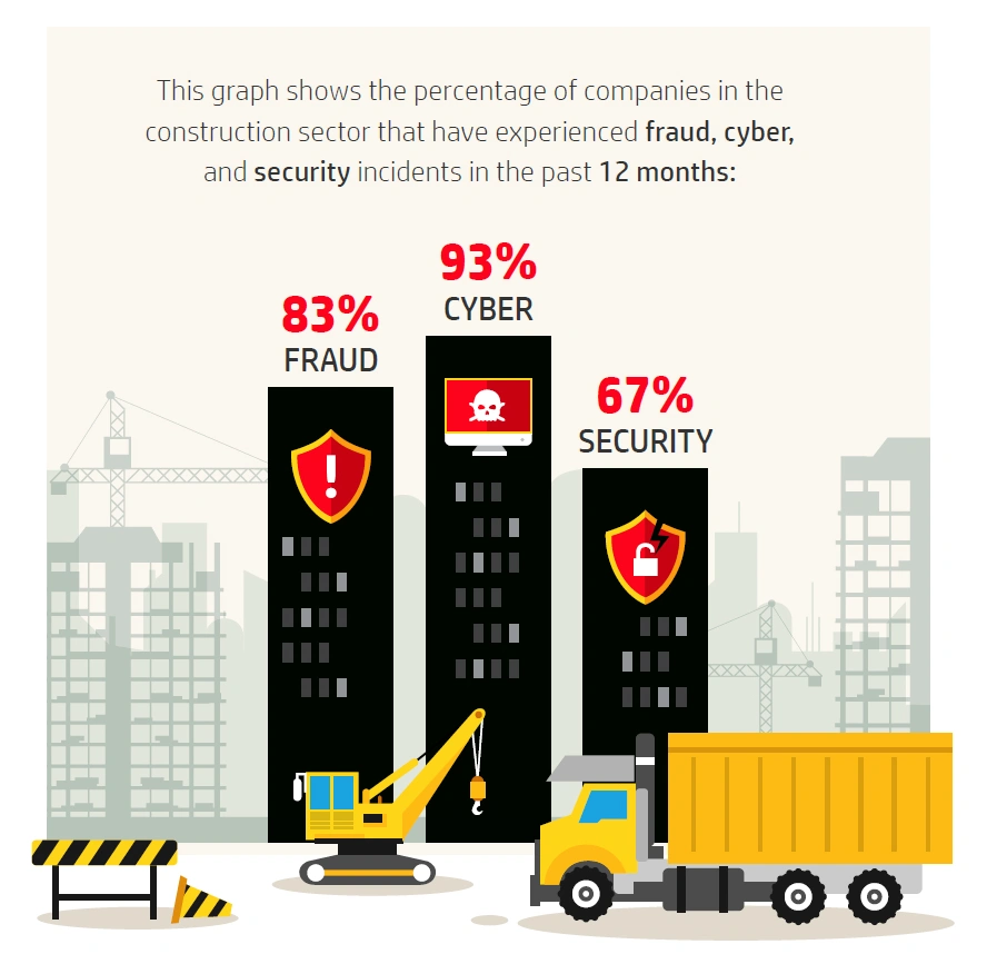 Many contractors leave security as a low priority due to the misconception that they don't have anything for a hacker to steal. But that's not true. This graph shows the percentage of companies in the construction sector that have experienced fraud, cyber, and security incidents in the past 12 months: