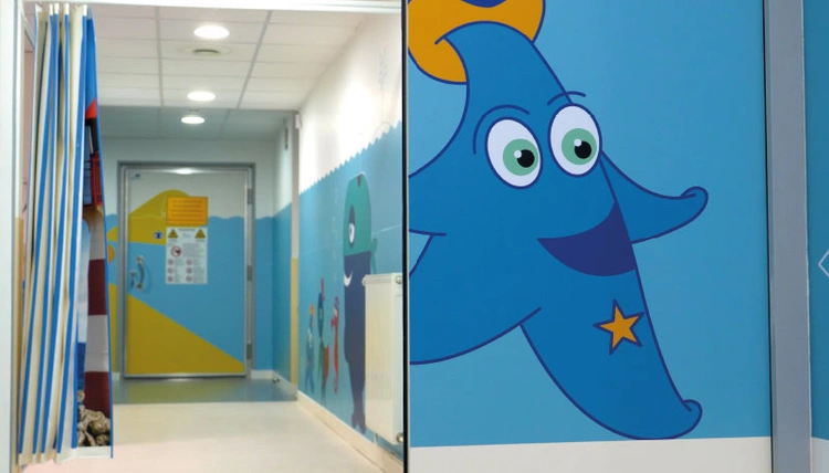 En faisant des recherches sur le web, Ingrid Brinster découvre les articles HP Latex et la réalisation réalisée pour l’IRM de l’hôpital de Barcelone. Elle prend contact avec un designer, HP et le reprographe. Au-delà de la décoration, l’idée est de créer un parcours dans la salle d’attente, tout au long du couloir, dans la salle d’examen jusqu’à la machine. Les 120m2 d’impression réalisés font partie d’un projet global sur la prise en charge de l’angoisse et de la douleur. L’impression devra rassurer et accompagner. Les couleurs et les graphismes – sur le thème de la mer, Brest oblige – doivent capter l’attention des enfants comme des adultes et les détendre. La qualité et la justesse d’impression étaient essentielles pour que la thérapie porte ses fruits. Le bleu du couloir doit être très dense pour plonger les enfants dans un état hypnotique. Ce projet a été conçu avec des hypnothérapeutes. Les résultats se sont faits sentir très rapidement. Les petits patients n’ont plus eu besoin d’être sédatés pour consentir à l’examen. Plongés dans un état hypnotique, ils sont accompagnés par une étoile de mer qu’ils connaissent bien puisqu’elle leur tient compagnie depuis la salle d’attente. Pour que l’hypnose fonctionne, le graphisme et les couleurs doivent être suffisamment attractifs pour capter leur attention mais assez simples pour ne demander aucun effort de réflexion.
