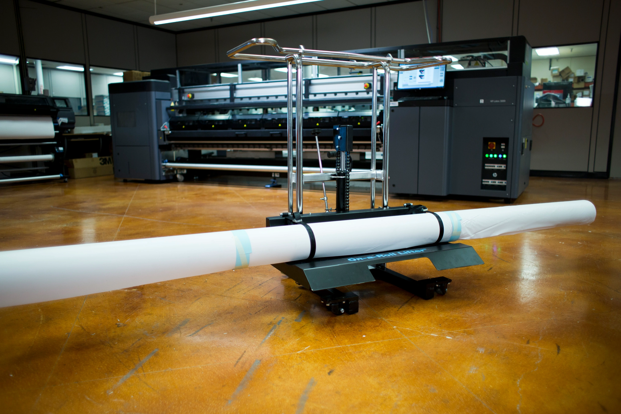 "Loading and unloading rolls used to be a two-person job with a higher risk of back injuries from lifting. The Low Profile On-A-Roll® Lifter minimizes this risk and enables a single operator safely handle heavy and wide rolls. Co-designed with HP, the Low Profile On-a-Roll® Lifter fits perfectly inside all Large Format Latex and Stitch printers."