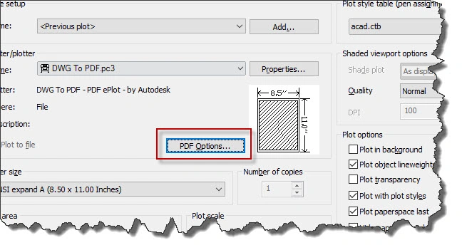 The Printer/plotter dropdown list also contains various PDF printing options, as seen in the image below. We’ll cover the different AutoCAD-to-PDF options later in this guide.